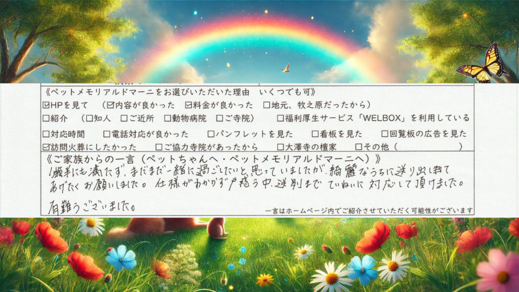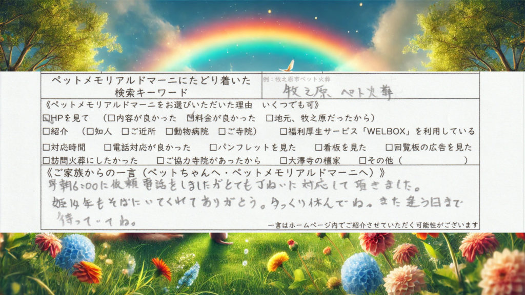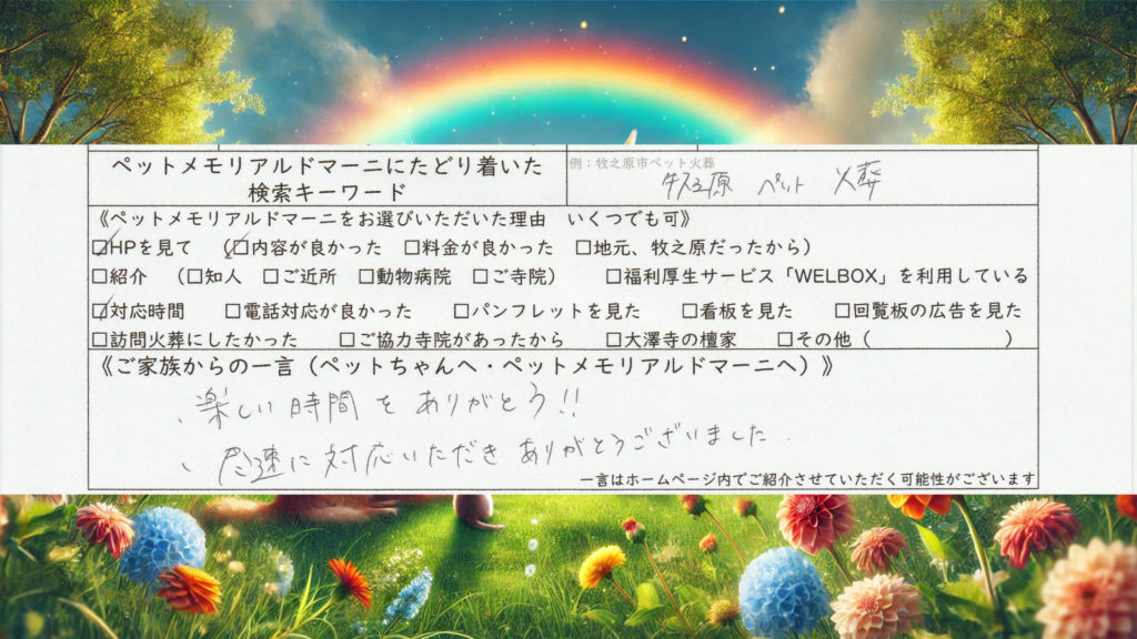 ペットちゃんは家族の一員であり、思い出は私たちの心に永遠に残ります。