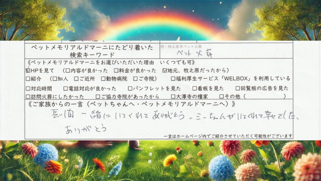 大切なペットちゃんを失った時、その悲しみや喪失感は言葉では表現しきれません。ペットメモリアル ドマーニは、ご家族様に寄り添い、ペット訪問火葬サービスを通じて、ペットちゃんに感謝を伝えるお手伝いをさせていただきます。