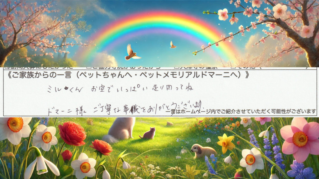 また、お気持ちのこもったお言葉をお寄せいただき、ありがたく拝読いたしました。ミルくんとのお別れが少しでも穏やかな時間となっておりましたら幸いです。