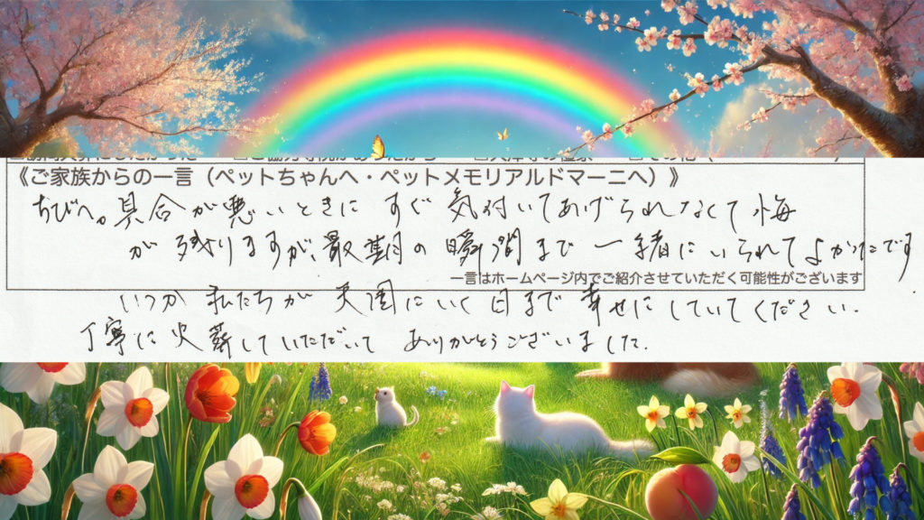 ちびくんと過ごされた最後のお時間をご家族様が「一緒にいられてよかった」と思われたこと、そのお気持ちが何より大切なのだと感じております。