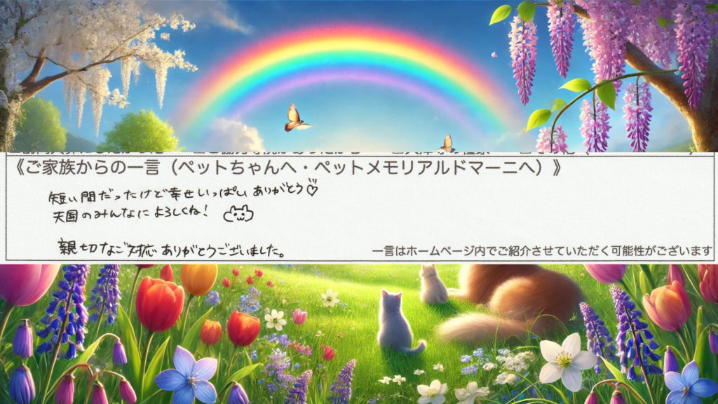 ご供養に関するご相談がございましたら、どうぞお気兼ねなくお声がけください。ミルくんが天国で仲間たちと出会い、穏やかに過ごせますよう心よりお祈り申し上げます。