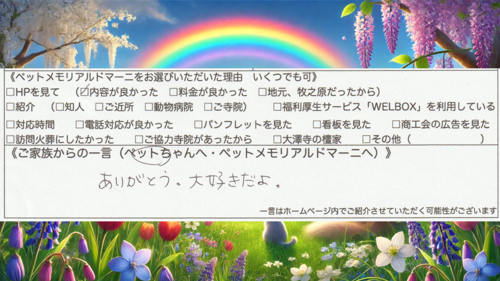 このたびは御前崎市のペット火葬 ペットメモリアル ドマーニをご利用いただきありがとうございました。