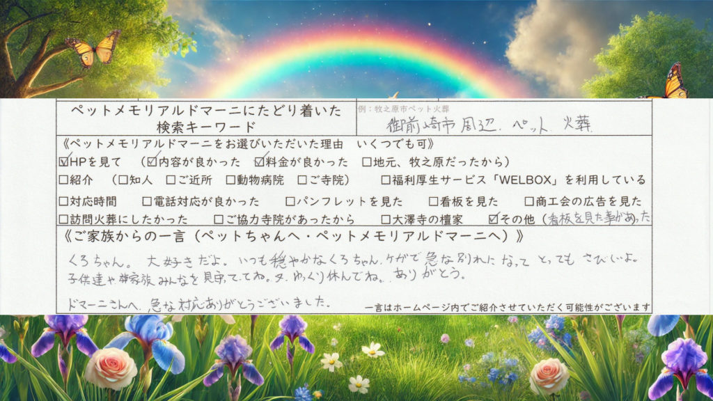 静岡県御前崎市のペット訪問火葬 ペットメモリアル ドマーニをご利用いただきまして誠にありがとうございます。