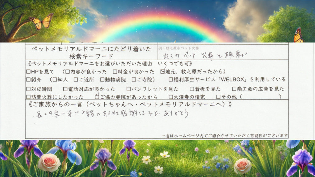 このたびは静岡県牧之原市のペット訪問火葬ペットメモリアル ドマーニのご利用誠にありがとうございます。
