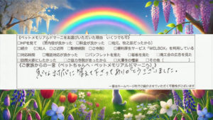 静岡県牧之原市のペット訪問火葬 ペットメモリアル ドマーニをご利用いただきありがとうございました。お別れという大切な時に、こちらにまでお気遣いのお言葉をいただき感謝しております。ミケちゃんの旅立ちがやすらかでありますよう […]