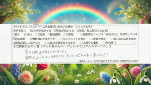 このたびは静岡県牧之原市のペット訪問火葬 ペットメモリアル ドマーニをご利用いただきありがとうございました。ゾラちゃんへ寄せられた感謝の言葉からも、ご家族様にとって大切な存在であったことが伝わってまいります。長い年月を共 […]