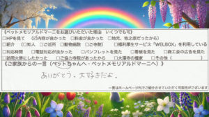 このたびは静岡県吉田町のペット訪問火葬 ペットメモリアル ドマーニをご利用いただきまして、誠にありがとうございました。りーたんはご家族様と日々を共にし、たくさんの愛情に包まれて暮らしてこられたことと思います。当日はご自宅 […]