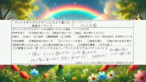 このたびは静岡県吉田町のペット訪問火葬 ペットメモリアル ドマーニをご利用いただきまして、誠にありがとうございました。りーたんはご家族様と日々を共にし、たくさんの愛情に包まれて暮らしてこられたことと思います。当日はご自宅 […]